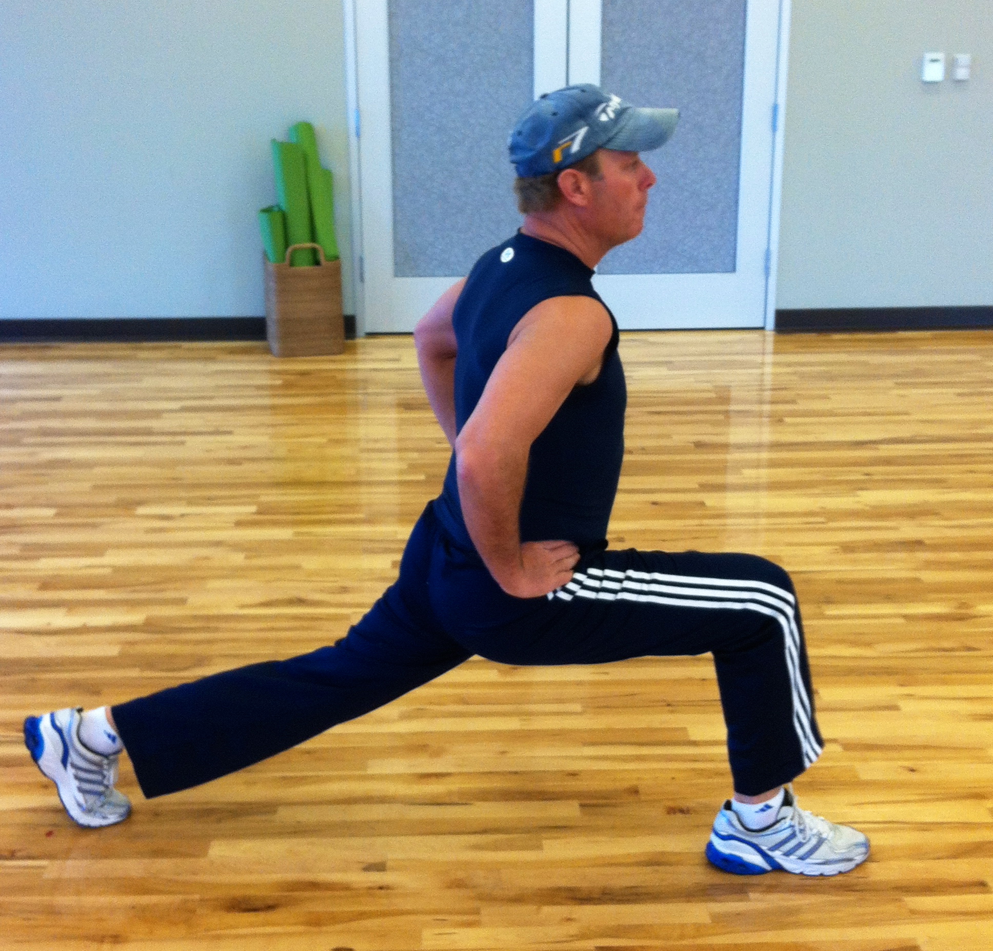 The first thing you want to do is make sure you are flexible enough to take a longer stride as shown. Also, you want to engage the shoulder and hips by swinging the opposite arm and leg (left foot forward and right arm forward and visa versa). This will stretch the hips and shoulders as they move in opposing direction. This separation is very important in making a golf swing and is a great pre-round warm up. Start slowly with this motion until you get the coordination perfected and then you can step up the pace.